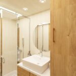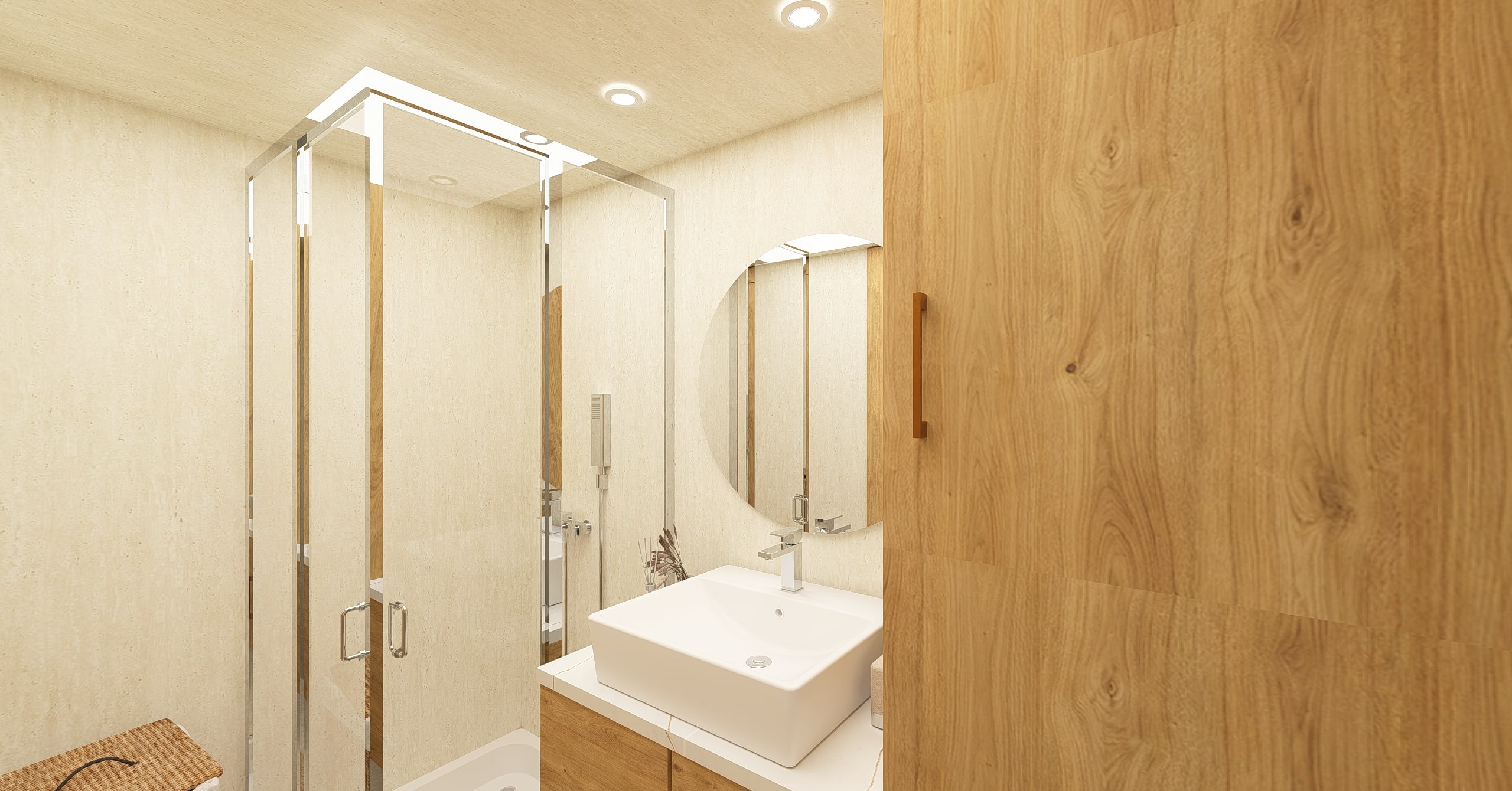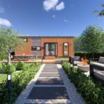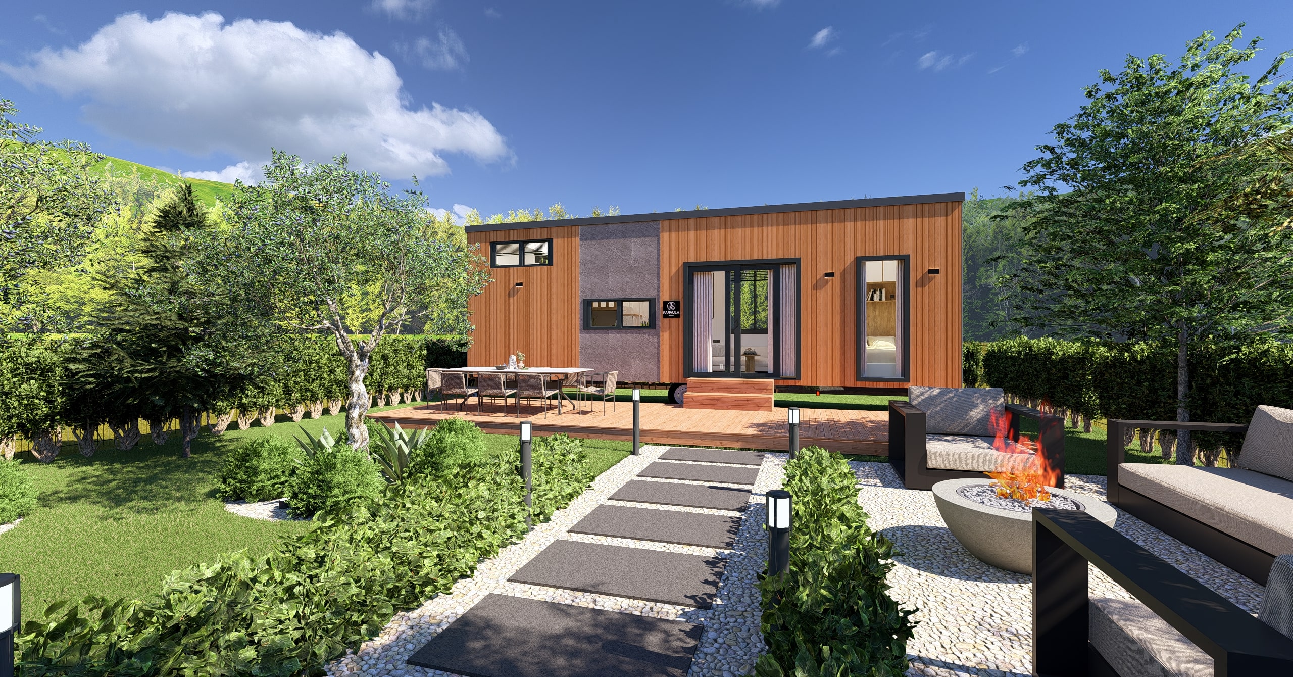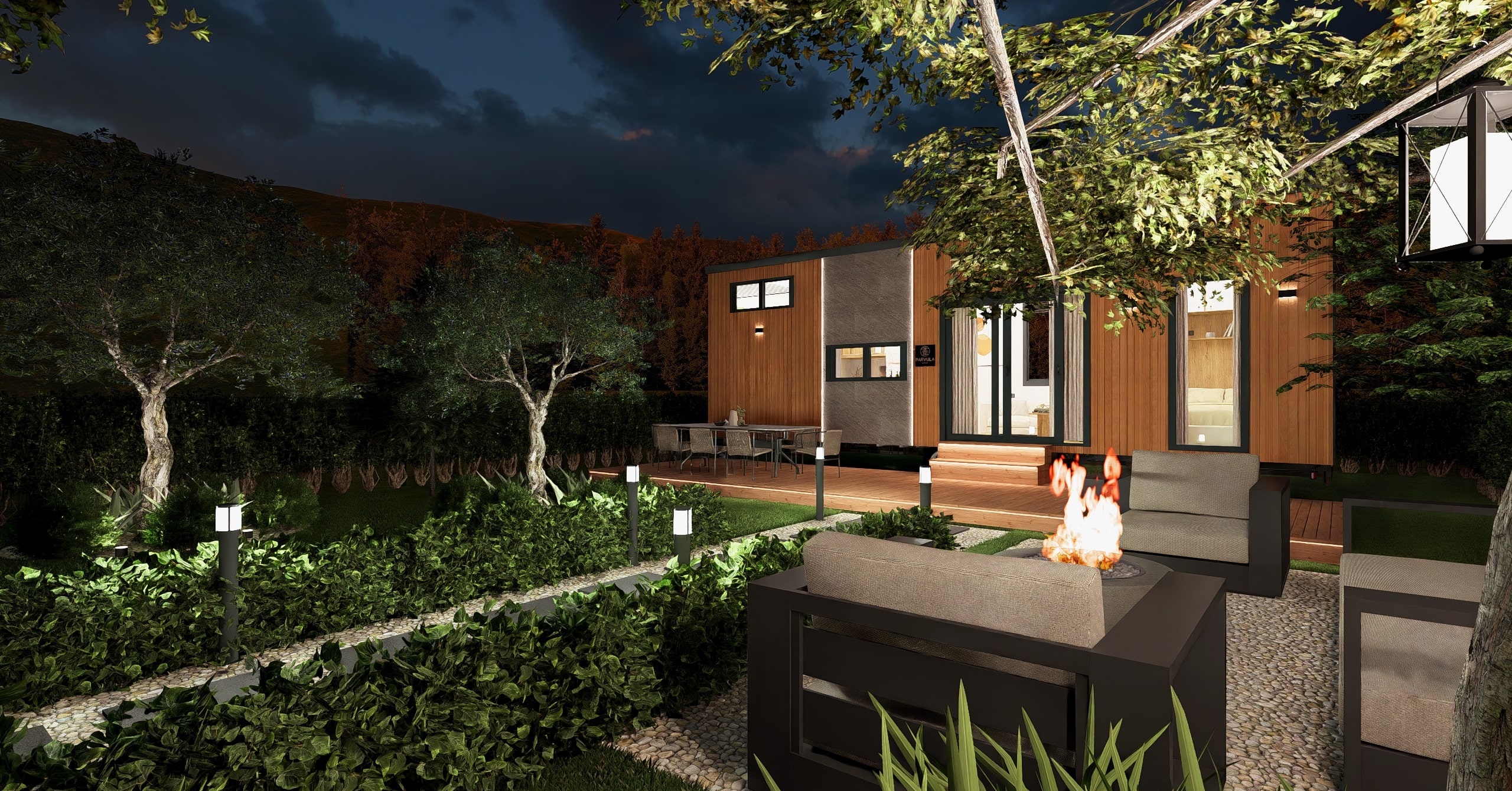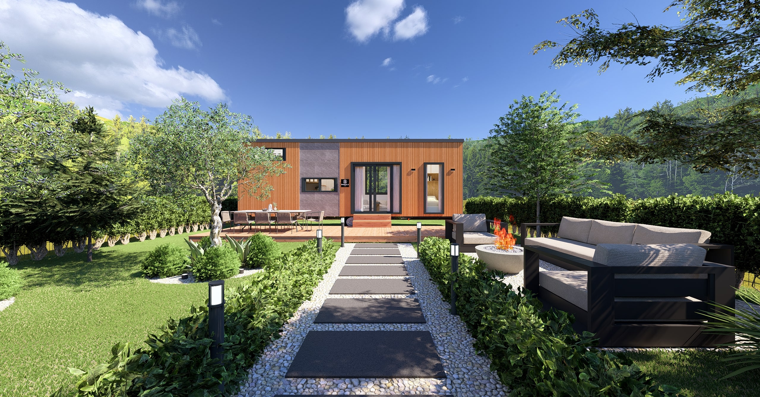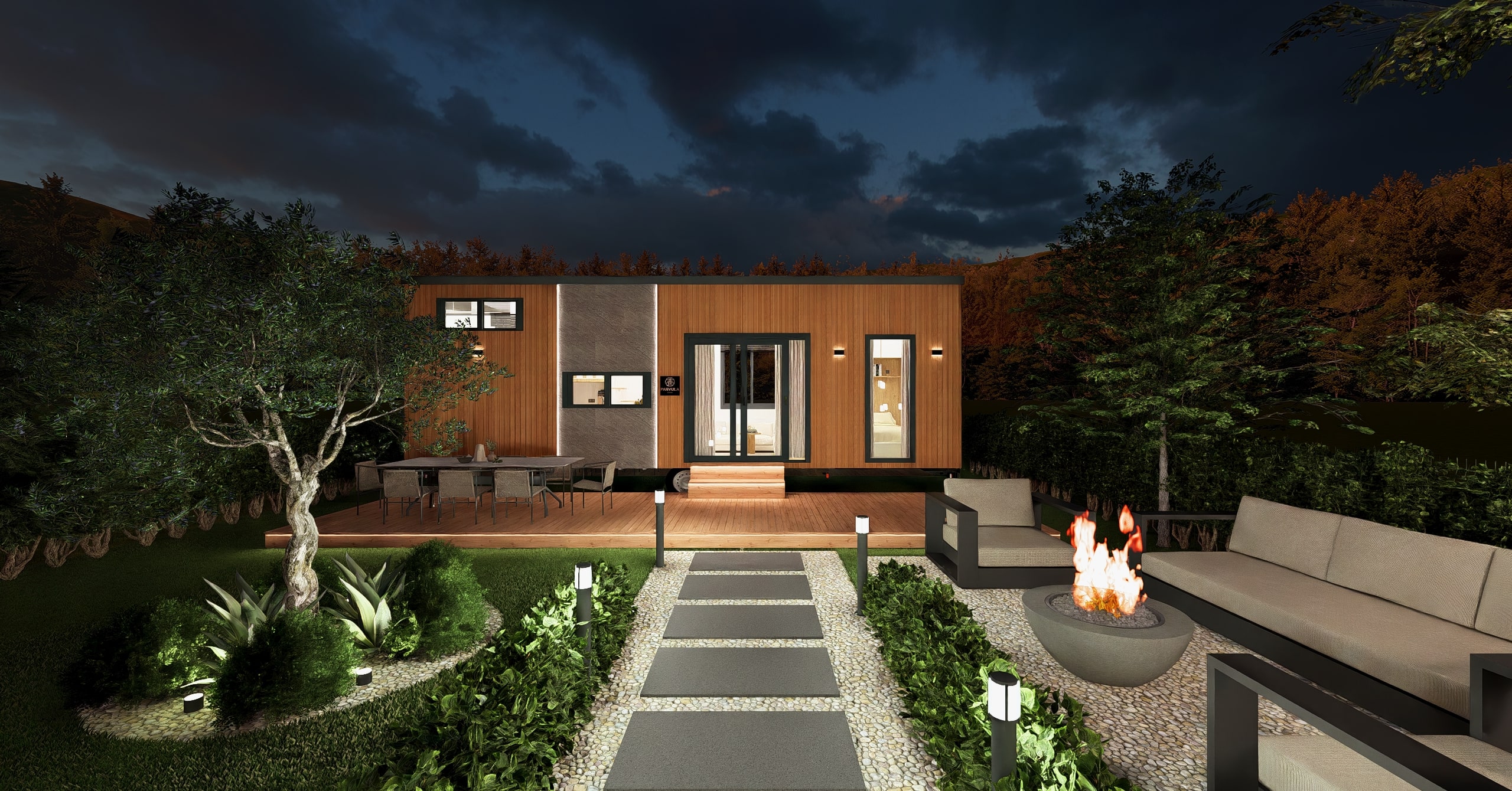 Ön cephe: Thermowood ısıl işlem görmüş ayous ağacı marin kontrplak üzeri nem bariyeri sonrası karkas sistemli uygulanır ön arka komple cilalanır , ön cephe led ışıklı ithal taş kaplama panel uygulaması ile uygulanır