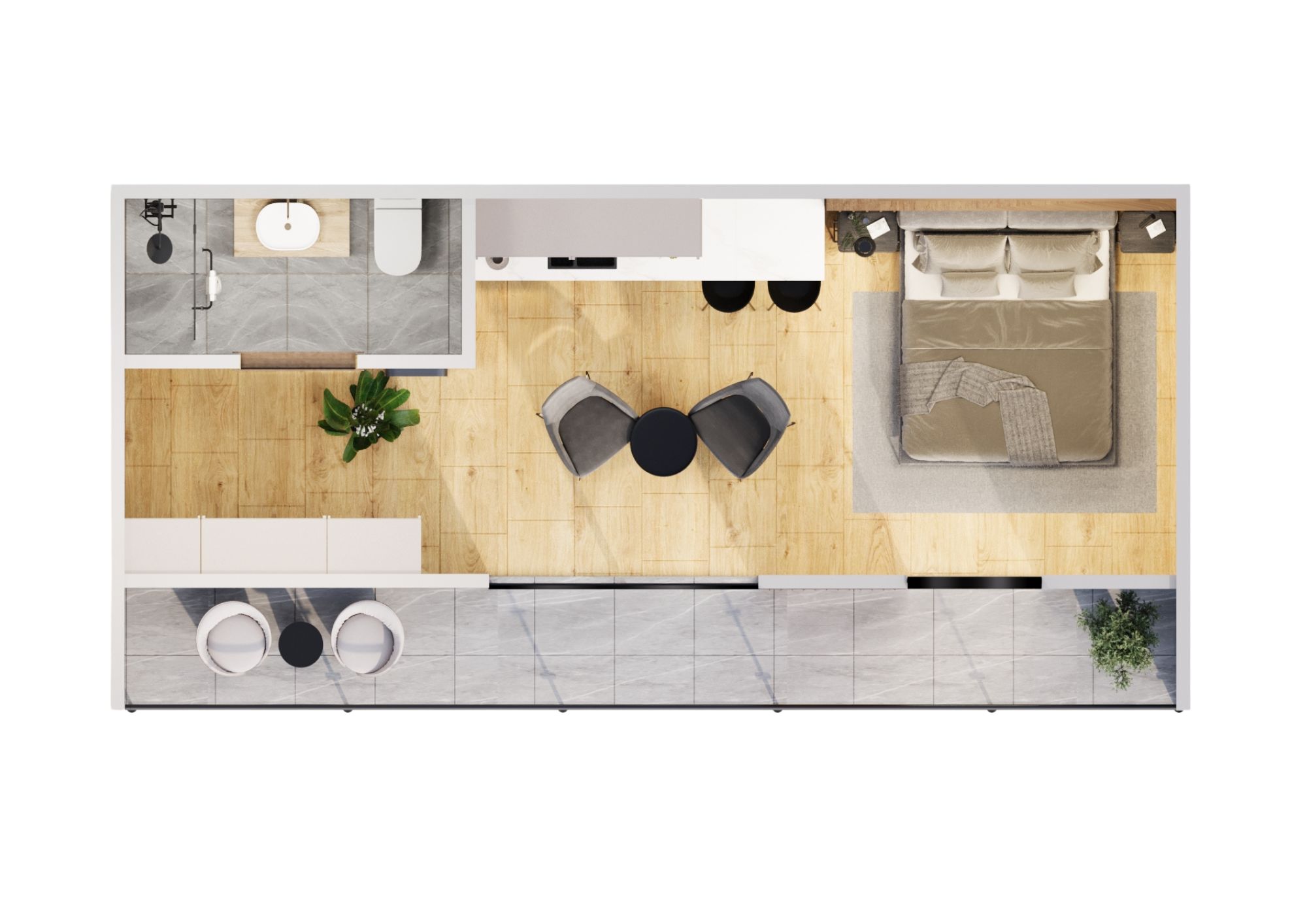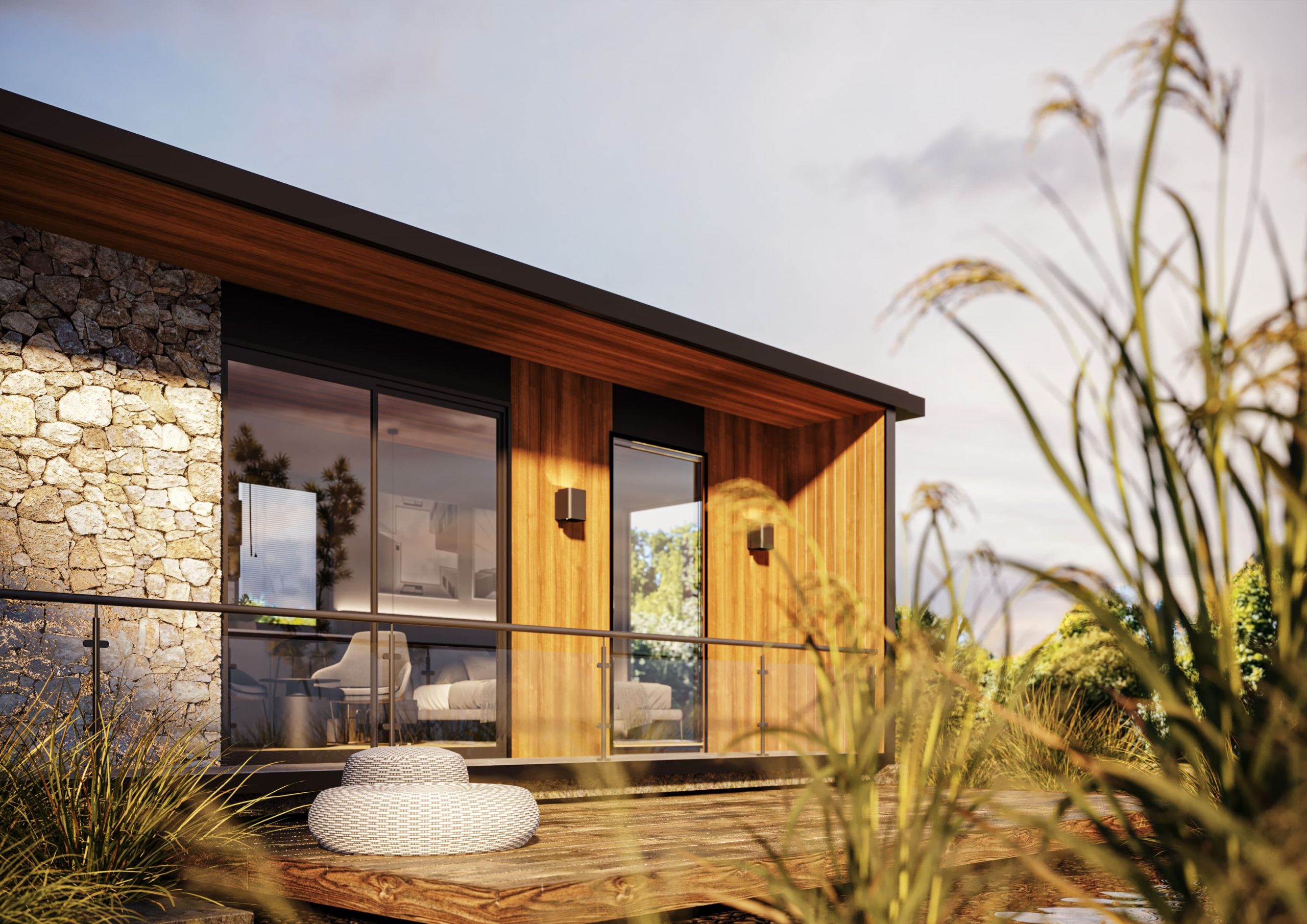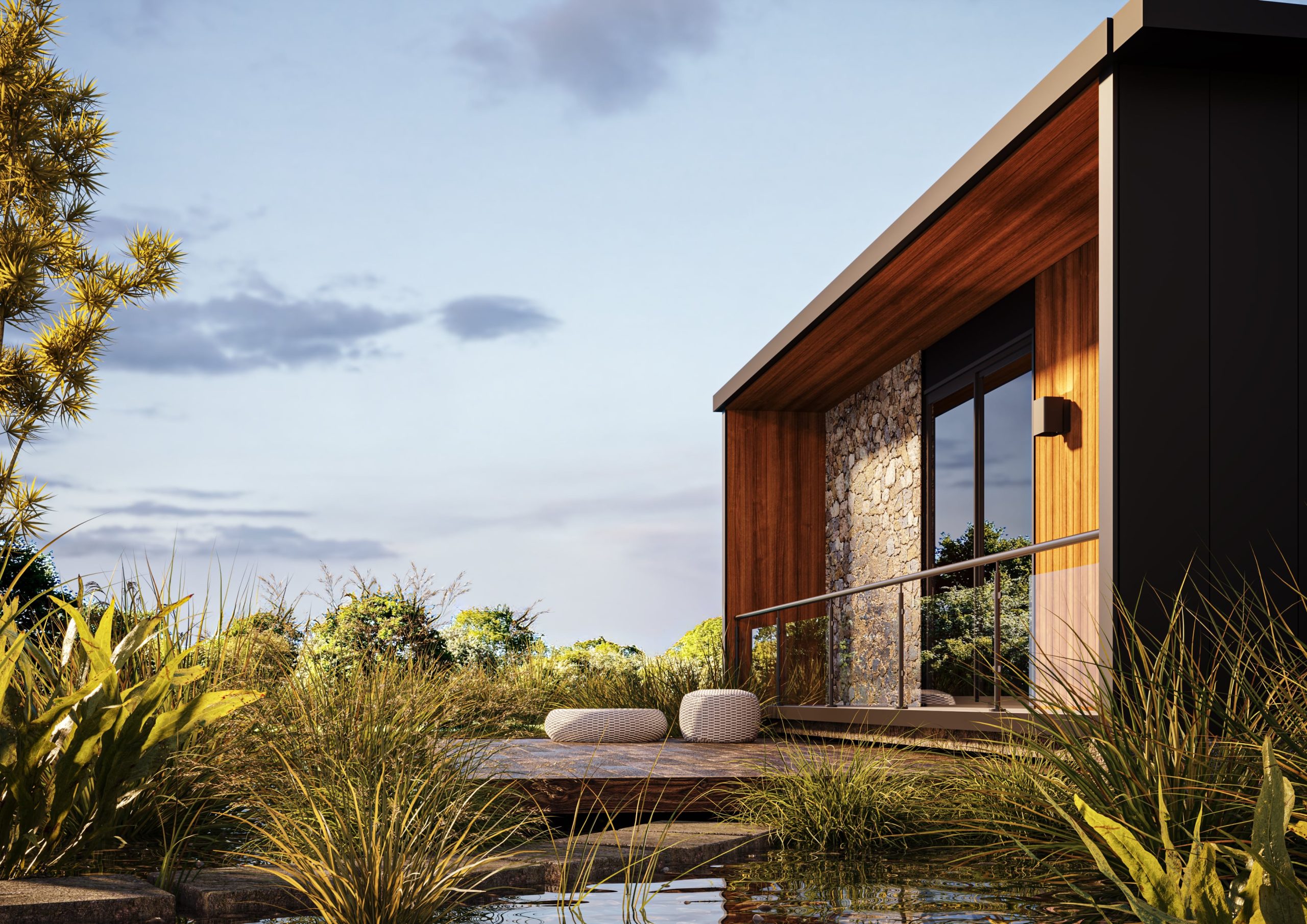 Ön cephe: Thermowood Ayos ağacı ve taş kaplama detayı