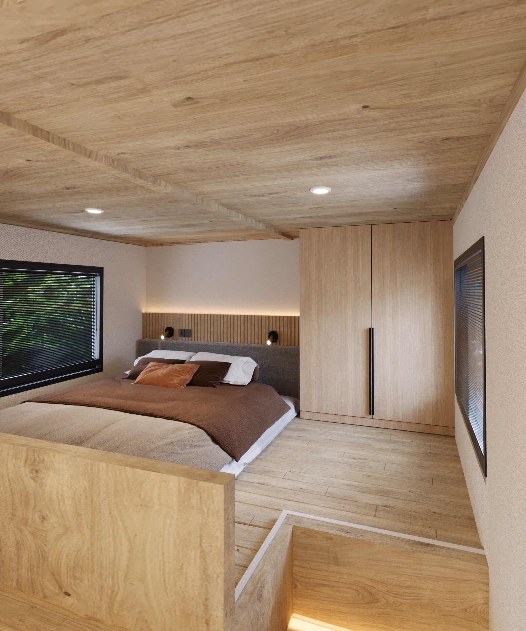 • Ön cephe: Thermowood ısıl işlem görmüş ayous ağacı  marin kontrplak üzeri nem bariyeri sonrası karkas sistemli uygulanır ön arka komple cilalanır , ön cephe led ışıklı  ithal taş kaplama panel uygulaması ile uygulanır