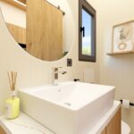 80×80 cm sürgü cam duşakabin ve duş teknesi, banyo dolabı.